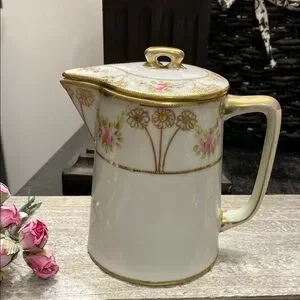 Exquisite porcelain pitcher or pot with floral design and gold accents. Pre 1921 manufacture. No chips cracks or crazing! Approximately 5.5”h x 5.25” across spout to handle. Some gold wear on the handle as shown in picture as could be expected from a piece that was used. Acquired from a Nebraska estate. Considerate offers are welcomed on listings over $15. May be bundled with another listing/s to save $$ on shipping as well.