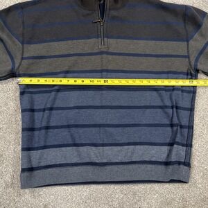 Authentic Tommy Bahama men's quarter-zip sweater in size XL. Features a horizontal stripe pattern in shades of navy and gray with ribbed collar, cuffs, and hem. Crafted from a comfortable cotton/polyester blend for softness and durability. Ideal for layering in cool weather or casual outings.