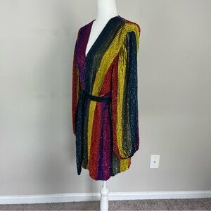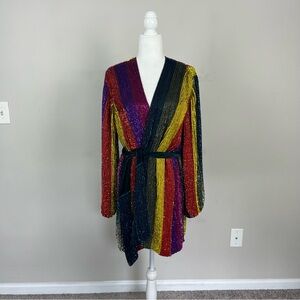 Tags: party, beaded, statement sleeves, wrap, sequins, rainbow, colorful, mini, vneck