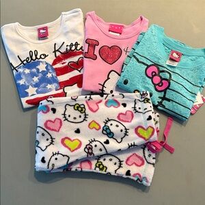 Hello Kitty tee shirt bundle of 3 tee shirts and a bonus fleece pants. All pieces are girls size 6 pre loved and in good condition. The blue shirt is size 6/6x and is new with tags.