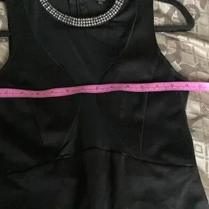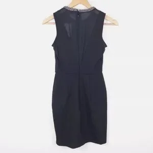 All eyes will be on you in this sexy black dress with a stunning rhinestone neckline and sheer panels. Sheer insert at back, side & front. Material is thicker and soft expensive feel. Bodycon style. Hidden back zipper. Please note a few jewels are missing on both sides at same spot (as pictured). Doesn’t take away from this statement piece, priced accordingly. Perfect for prom, weddings and formal events. Stock picture is not of exact dress as it doesn't have the sheer sections.