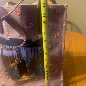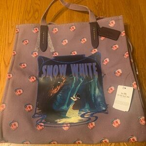 Charming Coach tote with Snow White design. Features purple and pink hues. Ideal for a whimsical touch.