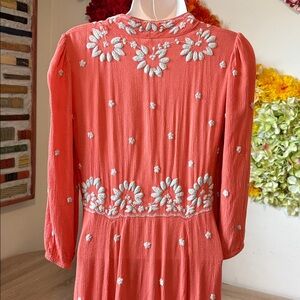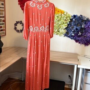 This stunning Free People Fable midi dress features beautiful floral embroidery throughout in a gorgeous coral pink shade. The dress has a flattering V-neckline, empire waist, and three-quarter bubble sleeves with stretchy hems. The front waistline is stretchy for comfort and the dress hits at midi length.