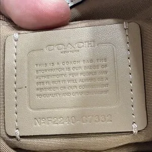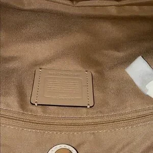Stylish Coach shoulder bag with signature pattern. Features tan and cream tones. Perfect for everyday elegance.