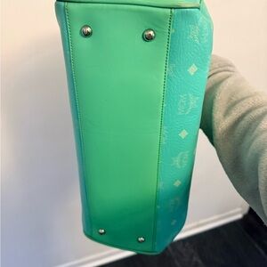 Chic MCM tote with vibrant floral embroidery. Aqua color adds a fresh touch. Ideal for daily wear.
