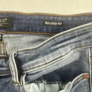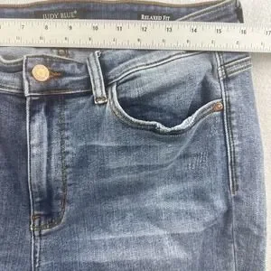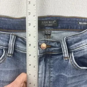 The product is a pair of Judy Blue relaxed fit distressed blue jeans in juniors size 15/32. These jeans feature a solid pattern with a medium fabric wash and a high rise. The jeans have a zip and button closure, are machine washable, and made of denim fabric. The relaxed fit and distressed detailing give them a trendy and casual look, perfect for everyday wear. The straight style and blue color make them a versatile addition to any wardrobe.