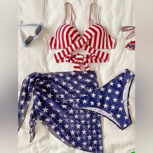 3pc Patriotic Striped Star Push Up Bikini Set with Sarong
