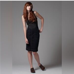Chic charcoal midi dress. Sleeveless with a fitted silhouette. Ideal for versatile styling. Charcoal cotton cowl neck & bodice with a stretchy denim fitted waist. Very flattering, but quite firm fitting so I am sizing up to a medium. First TTS, 26/27/Small