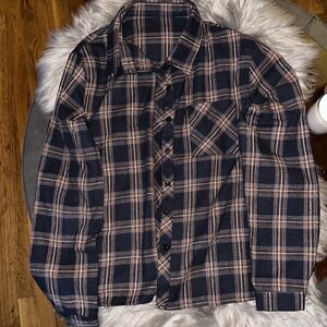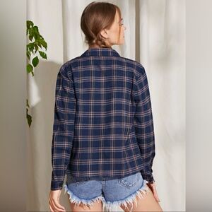 NWOT ROMWE plaid button down pocket shirt. Size small. Navy blue with brown tones. 10 percent of earnings will be donated to NEDA