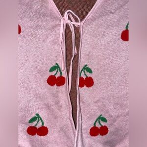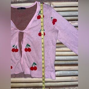 This charming pink cardigan features delightful cherry embroidery, perfect for adding a playful touch to your wardrobe. Ideal for layering, it combines style and comfort effortlessly.