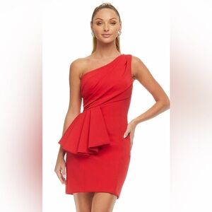 One Shoulder Fitted Cocktail Dress with Ruching. It features a rouched bodice and waist embellishment.