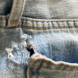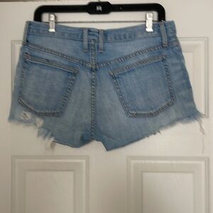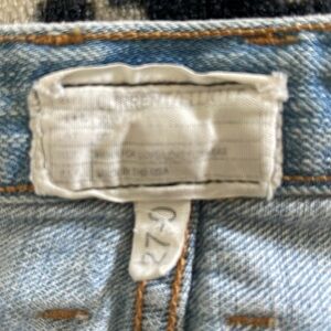 Distressed blue jean shorts - see pics - left leg more frayed then right - hole by left rear pocket - otherwise in good pre owned condition - size 27