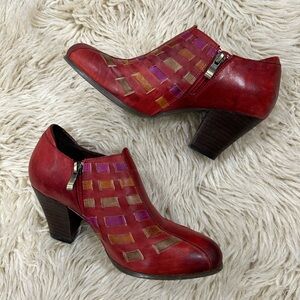 Stylish ankle booties with a vibrant red base. Features purple and orange accents. Chunky heel for added height.