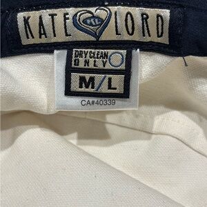 Stay stylish and protected from the sun with this classic Kate Lord bucket hat! Made from 100% cotton in a crisp white, it features a chic navy blue trim along the brim for a touch of contrast. This hat is designed for comfort and versatility, perfect for beach days, gardening, or adding a casual flair to your everyday look. Approximately 23” circumference.