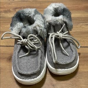 Soft and warm slippers for kids. Features plush faux fur lining. Easy slip-on design.