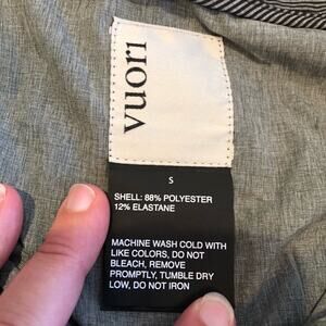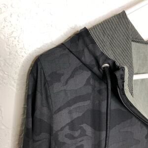Vuori black gray camo zip front hooded jacket. Full zip front. Hood in back. Zipper side pockets. Drawstring waist. Interior chest pocket. Size Small. Excellent preowned condition. Minor wash wear.
