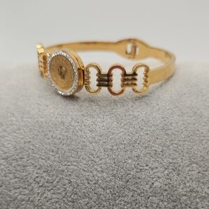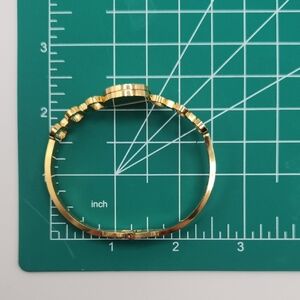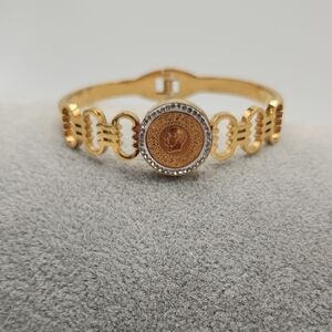 This stunning 18k gold plated stainless steel bangle bracelet features a unique coin design, perfect for adding a touch of elegance to any outfit. The intricate detailing and luxurious gold color make it a standout piece in any jewelry collection. Hinge design opens from the top/front. A modern piece with vintage aesthetic.
