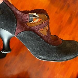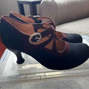 Chic and stylish black suede Pearl Hart heeled Mary Janes with burgundy trim accents. GUC - some wear… please see photos for specifics as these are part of the item description. Lovely and comfortable but I have other Fluevogs I reach for first so they deserve a home where someone will love them.