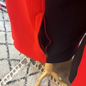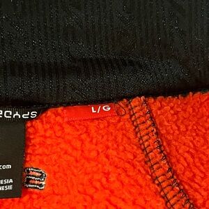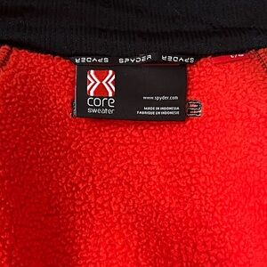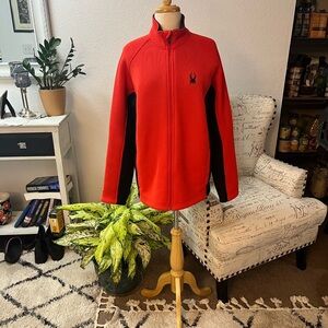 Bold red (has an orange look to it) and black design. Features Spyder logo. Ideal for warmth and style. Heavy duty knit jacket with two pockets.