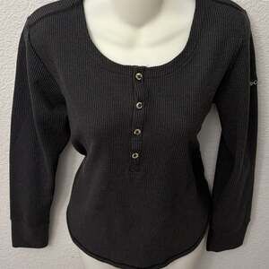 Columbia Women's Black Waffle Knit Henley Top, size Medium. This versatile long sleeve shirt features a classic four-button henley neckline and a comfortable waffle texture. Designed with a curved hem and logo detail on the sleeve, it's perfect for layering or as a casual base layer for outdoor activities. Excellent pre-owned condition with no stains, holes, or significant wear. Soft and breathable fabric makes it a great choice for year-round comfort.