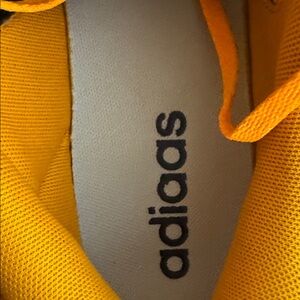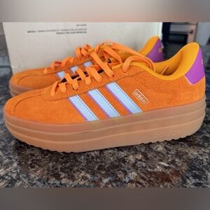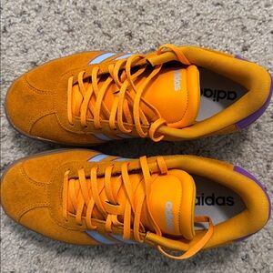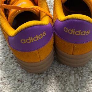 Not worn much. Bold orange Adidas sneakers with purple heel and white stripes. Comfortable and stylish design. Regular fit