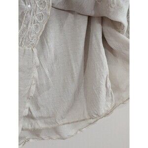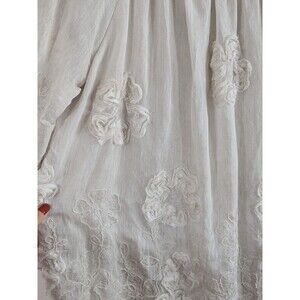 The Tempo Paris Ivory Boho Tunic is a flowy and whimsical piece featuring 3D flowers and sequins, perfect for a fairy-like character. Made of silk and cotton chiffon, this tunic has a scoop neck and 3/4 relaxed sleeves, making it a comfortable and stylish choice for a boho chic look. The cream color and oversized fit add to the ethereal and dreamy vibe of this tunic, ideal for those who love intricate detailing and unique accents in their clothing. There is a very faint stain. Please check the last picture for reference.