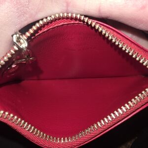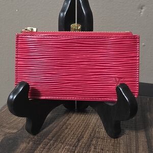 Excellent pre-owned condition Authentic Louis Vuitton Red (Scarlett color)Epi Leather Coin Pouch (Zippy Coin Purse in Epi) is a small, functional accessory crafted from durable, textured Epi leather. It is designed to hold coins, cards, and keys, often featuring a secure zipper with an LV logo pull. No corner wear, no stains & no odors. Only wear would maybe by the zipper see pic 5. Gold hardware has a very little tarnishing.