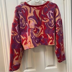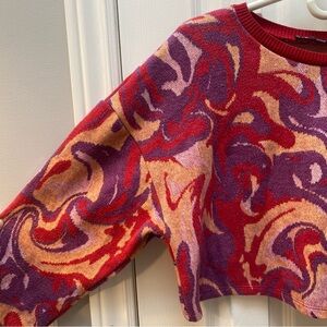 women’s M / 66% polyester 31% viscose 3% elastane In excellent condition. Beautiful abstract marbled design with purples, red, yellow, cream. Would keep it if it weren’t cropped but unfortunately it’s just not my style! On me the hem rests at bellybutton. Pit to pit - approx 22” Shoulder seam (beside neck line) to bottom of sweater - approx 18”