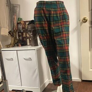 Stylish plaid women's pants featuring a vibrant green and red pattern. Perfect for adding a pop of color to your wardrobe.