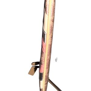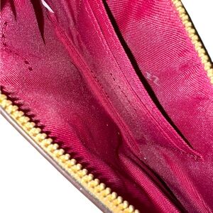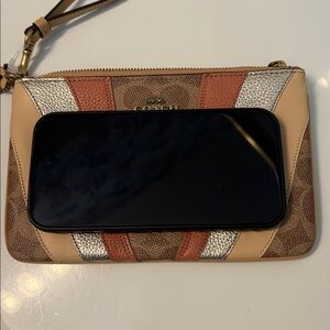 This is a beautiful Wristlet/bag that will catch the eye! EUC and Artistically designed with a neutral pallet of wave patchwork that makes it versatile. Leather zipper pull is zippy. Easily fits a phone and other essentials. Classic brown kissing Cs with coordinating neutrals. Gold hardware and original tag.