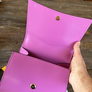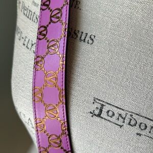 Gorgeous Valentino lavender leather Crossbody. Comes with dust bag. Large gold tone Valentino logo on the front flap. Snap closure. Crossbody strap can be worn with the copper tone logo exposed or with plain lavender. Drop on non-adjustable cross strap approximately 20 inches. Only call out are some scratches on the gold tone logo.