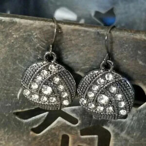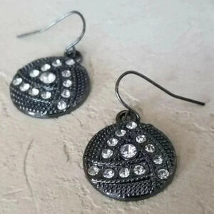 These gunmetal finished pewter dangle earrings feature Austrian Swarovski crystal rhinestones in a modern Avant Garde triangle pattern.
