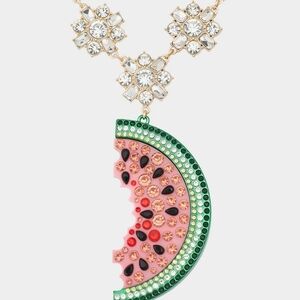 Welcome to Betsey's backyard with this whimsical necklace featuring refined chain with sparkly stone clusters and a vibrant watermelon pendant. Adorned with multi-colored stones. The necklace has an adjustable lobster clasp closure. Made from metal, glass, crystal, and resin.