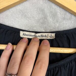 Abercrombie Fitch black peasant blouse with delicate lace detailing on the tiered sleeves. This airy top features a flattering scoop neckline with a tie detail and a relaxed silhouette, perfect for a casual day out or a relaxed vacation vibe.