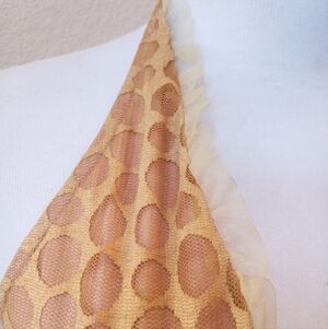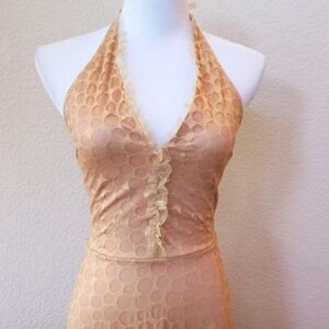 Heart Moon Star Y2K rose gold halter dress. Gold outer layer with a pink underlining. Overall great condition. One end of the hook and eye is missing and there is some pulling/minor tears on the halter stap as shown in the last two photos.