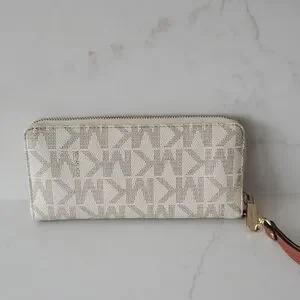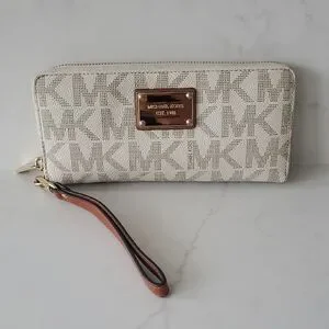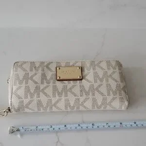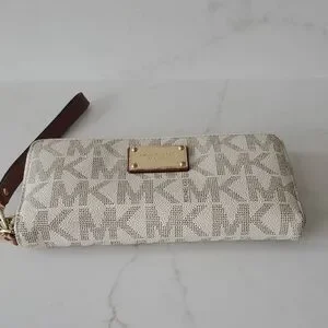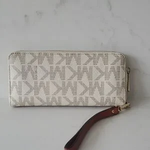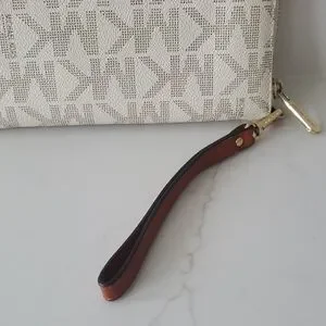 Elegant Michael Kors wristlet with signature logo design. Features a cream and brown color scheme. Ideal for stylish outings.