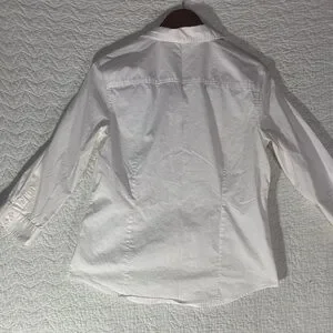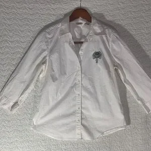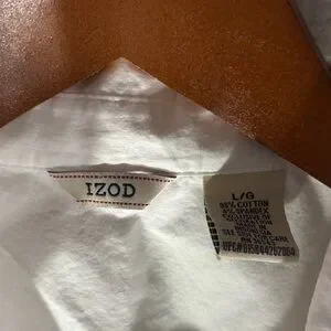 Classic white button-down by Izod. Features blue embroidered design. Ideal for casual or formal wear.