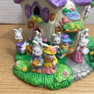 A charming hand-painted ceramic schoolhouse with adorable rabbit figures, ideal for collectors or as a whimsical decor piece.