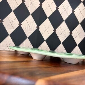 A cheerful and artfully crafted Barrarte pottery tray, designed to hold six deviled eggs or small treats. Painted in soft green hues and featuring a charming chicken motif alongside subtle pops of color, this piece embodies both festive charm and thoughtful Mid-Century craftsmanship.