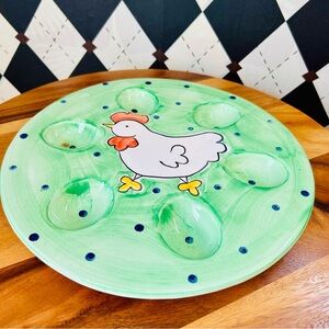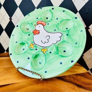 Barrarte pottery Easter egg tray deviled egg platter ceramic green hand-painted chicken motif festive kitchen serving dish Mid-Century colorful collectible tabletop décor