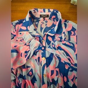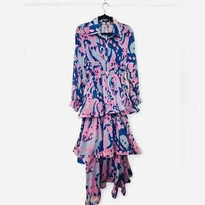 Retro Ripple Ruffle Summer Dress with pink and blue swirling abstract colors