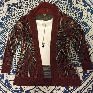 Stylish brown cardigan with intricate patterns. Open front design. Perfect for layering. Does not have tags