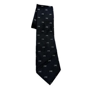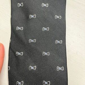 Silk tie printed with small bow ties. A cheeky nod to the formality of the event that has you wearing a Tie. In tiny pull on the part that would be under you collar, see pix. Otherwise flawless.