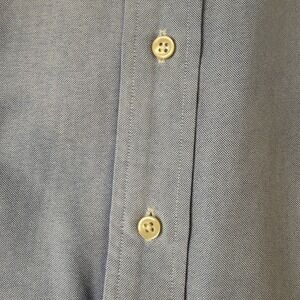 This shirt is in beautiful condition and has no wear on it. It has always been dry cleaned but can be easily washed at home. It's a light blue and is perfect for the office with dress pants, a business casual day, or the weekend with some jeans or tan shorts. 100% cotton. Excellent condition.