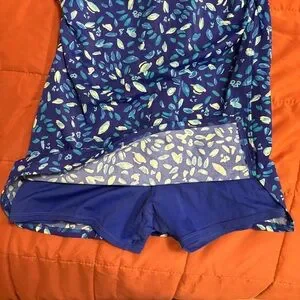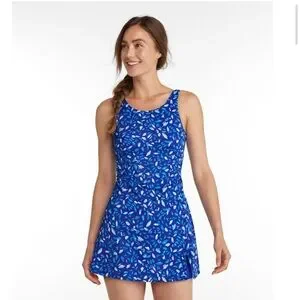 Super cute swim dress by L L Bean. Tank style top with scoop back, ruched waist, slit short skirt. Interior unitard is connected and has Boyshort bottoms. Interior shelf bra with soft cups (not removable), mesh lining. Made to fit snugly. UPF 50+ fabric.