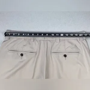 This is a pair of golf shorts by Adidas. Made of 100% polyester, moisture wicking, and light stretch material.