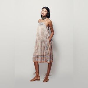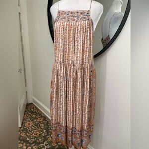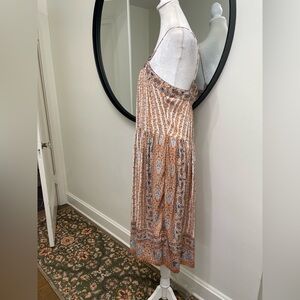 Silky printed midi dress featuring a cutout accent in back and hip pockets. Pleat detailing around the waist for an effortless look.
