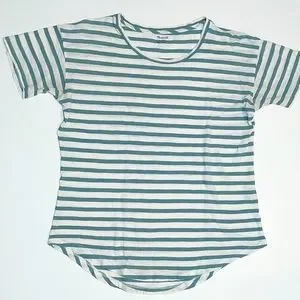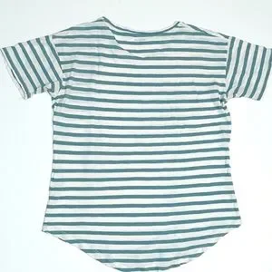 Bluish-green and white striped tee with rounded bottom hem. Size labeled XXS but fits more like a small.