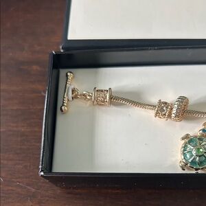 Chic Napier bracelet with gold finish and green charms. Adds elegance to any look.