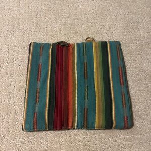 This clutch features a striking geometric pattern in black and white, showcasing intricate diamond and tribal-inspired designs. Its slim profile and textile material make it perfect for carrying small essentials, adding a touch of elegance to any outfit or a great piece for traveling. Good preowned condition
